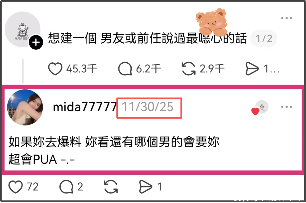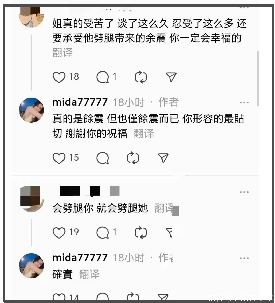顺着mida的社媒发言,还能看到她去年11月底的吐槽,表示前任说过最恶心的话是“如果你去爆料,你看还有哪个男的会要你,超会pua”,从交往时间线来看,基本上就是吐槽林俊杰了,不然她不会默默隐身好几年。清醒回头看,这句话不仅是威胁,还有严重的男凝,把女性价值建立在男性需求上。