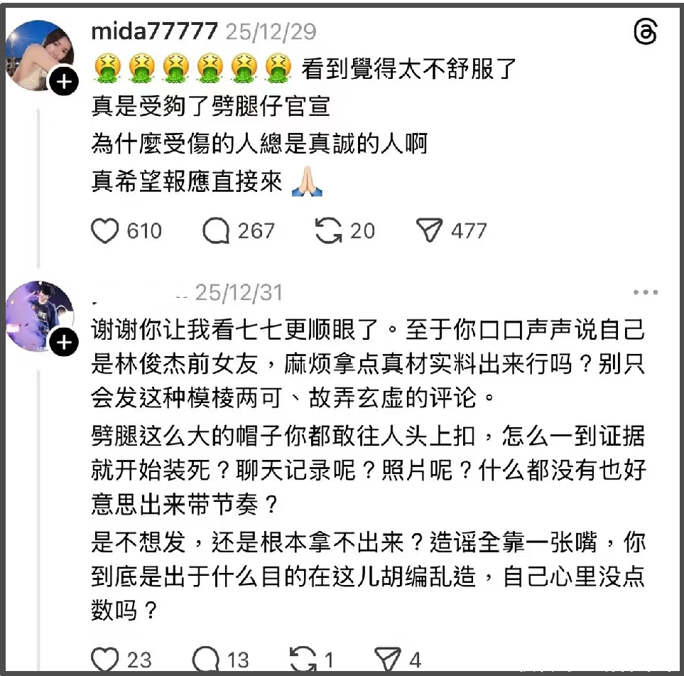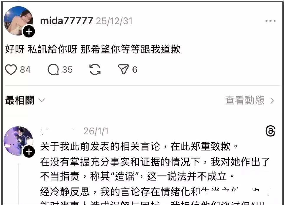 林俊杰与前女友mida合影曝光的过程相当滑稽,此前林俊杰官宣与七七恋情,mida隔空内涵林俊杰是劈腿仔,林俊杰粉丝在其评论区怒斥没证据是胡编乱造,mida就表示可以私信证据希望对方能道歉。之后,这位粉丝许是看到了证据,便在mida的评论区认真道歉,且反省了自己的不当措辞和激烈情绪。